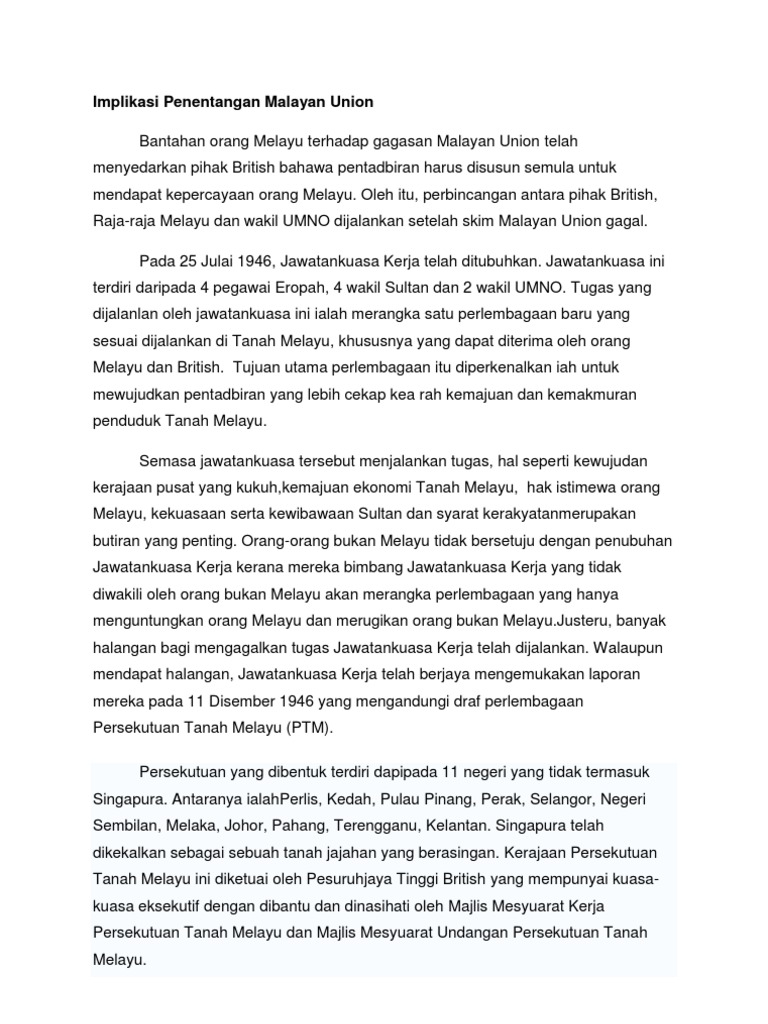 Malayan Union 9 from imgv2-1-f.scribdassets.com Akibat pada julai 1943, malayan planning unit (mpu) telah ditubuhkan di london untuk merangka perlembagaan baru yang sesuai dijalankan di tanah melayu selepas tamat perang nanti. Sebuah jawatankuasa eksekutif telah ditubuhkan pada 21 julai 1946. Kuasa kuasa sultan hanya terhad kepada soal agama islam dan adat istiadat dalam negeri sahaja. Dua hari selepas itu, sekali lagi dato' onn menyeru melalui akhbar majlis mencadangkan pertemuan dan perpaduan melayu dalm satu kongres disegerakan. Maklumat di bawah berkaitan dengan sebab penentangan orang melayu terhadap pengenalan malayan union 1946. Membentuk bangsa malayan union supaya golongan imigran menumpukan kesetiaan 2. Setelah berakhirnya perang dunia yang kedua, british telah kembali mentadbir tanah melayu. Orang melayu mesti bersatupadu menentang mu ii.